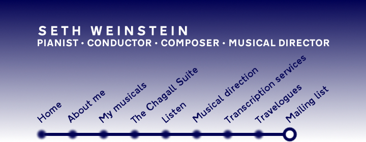 Home News and events About me Biography, background, press, and tidbits both musical and nonmusical My musicals Five shows I've written, including one that ran Off-Broadway in 2006 and one currently in development The Chagall Suite A commissioned 8-movement piano piece inspired by Marc Chagall's artworks, and a tribute to Chagall and Elvis Listen Hear my music on this site and buy my recordings Musical direction See my ideas regarding musical direction, see my resume, or let me coach you for auditions and give you accompaniment tracks to practice with Transcription services Send me a recording to create sheet music from, or have me transpose or arrange a song or instrumental work Travelogues Read accounts of my long-term trips and my experience on the Fosse tour Mailing list Subscribe to receive news and travelogues | Join the Mailing ListThanks for your interest in being informed of my upcoming events. Please complete the form below, and you will be added to my mailing list in time for the next update. To be removed from the list, please complete the removal form. |